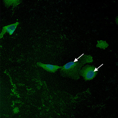 In control cells (left panel), the green staining indicates that NRF2 remains largely in the cytoplasm (arrows) without much protein located in the nucleus, which is counter-stained in blue. When cells are exposed to sulforaphane and Maitake (right panel), NRF2 moves to the nucleus (arrows) where it can bind to DNA to turn on expression of certain Phase 2 enzymes.